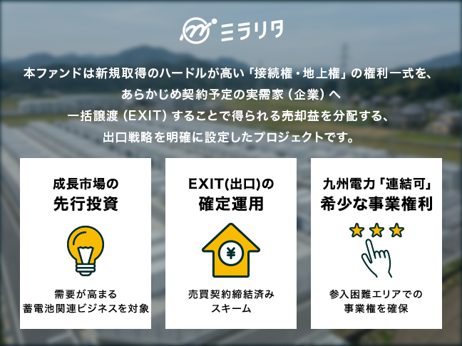 新規取得のハードルが高いこれらの事業権利一式を、あらかじめ契約予定の実需家(企業)へ一括譲渡(EXIT)することで得られる売却益を分配する、出口戦略を明確に設定したプロジェクトです。