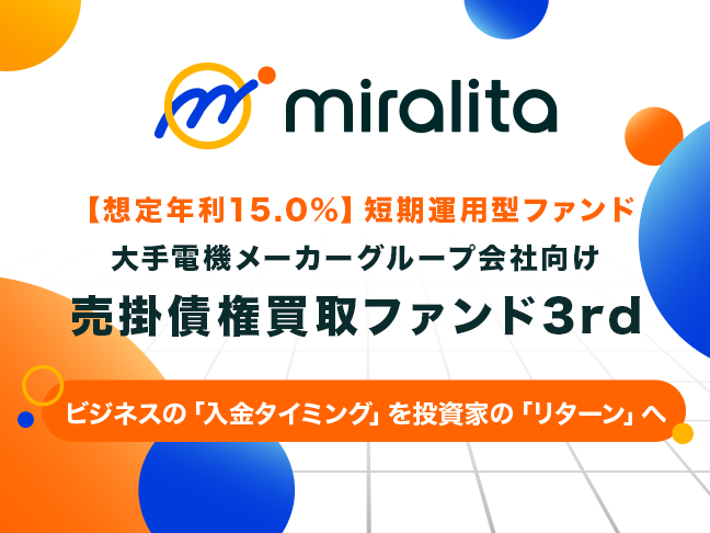 営業者である「ミラリタプロパティーズ株式会社」は、人材派遣会社が大手電機メーカーグループ会社に対して保有する売掛債権の買取を行い、当該債権の支払期日に実行される債務弁済を原資として、投資家の皆さまへ償還・分配を行う予定です。